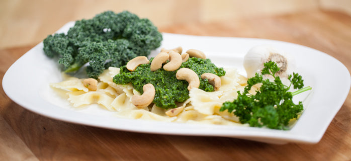 Try this healthy and delicious vegan alternative for traditional pesto. Yes, it's kale pesto. Some people cringe at the thought of eating kale, but it really can taste great, and it's good for you. Kale is one of the healthiest vegetables you can consume. Kale is high in vitamins A, C, and K. It's well-known for being packed with vitamin K.