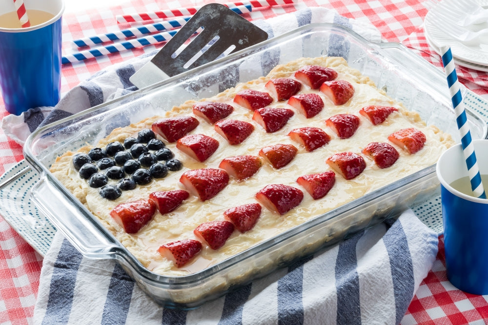 - Before serving, arrange the strawberries, raspberries, and blueberries in a flag pattern on top of your cheesecake. Add dollops of whipped cream or Greek yogurt for stars.