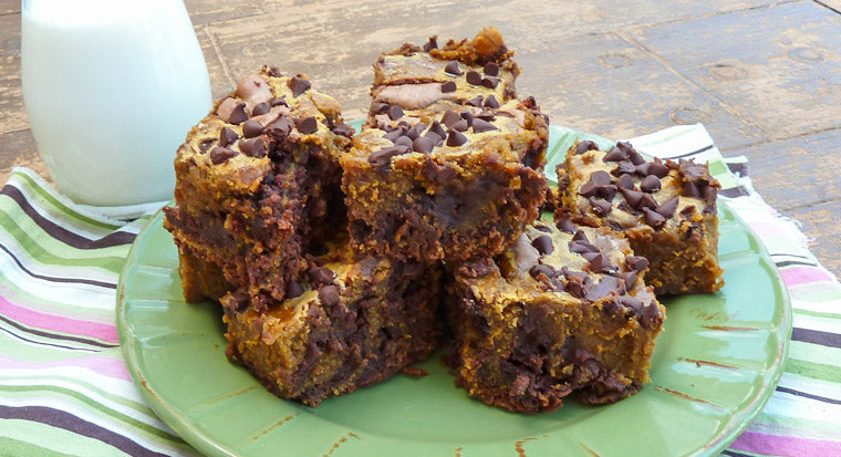 Pumpkin is often considered a fall food, but we love it year-round in our house! This recipe is great for any time of year—and even people who don’t usually like chocolate will dive into this. Just make it once and you love it too! The trick to this recipe is to mix the pumpkin and the chocolate separately, then add them to the pan to create more of a marble look.